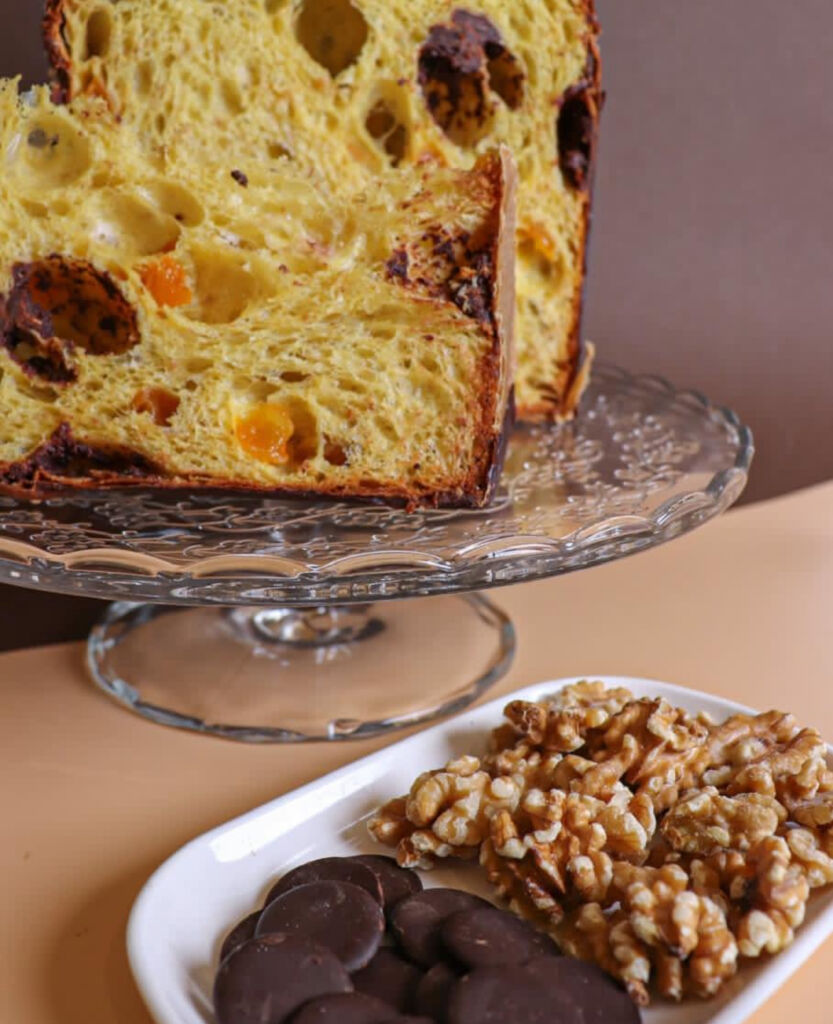 Panettone artigianale fatto a mano e con lievito naturale, alla gianduia, albicocche e noci è una deliziosa variante di panettone, preparata con maestria utilizzando ingredienti di alta qualità.